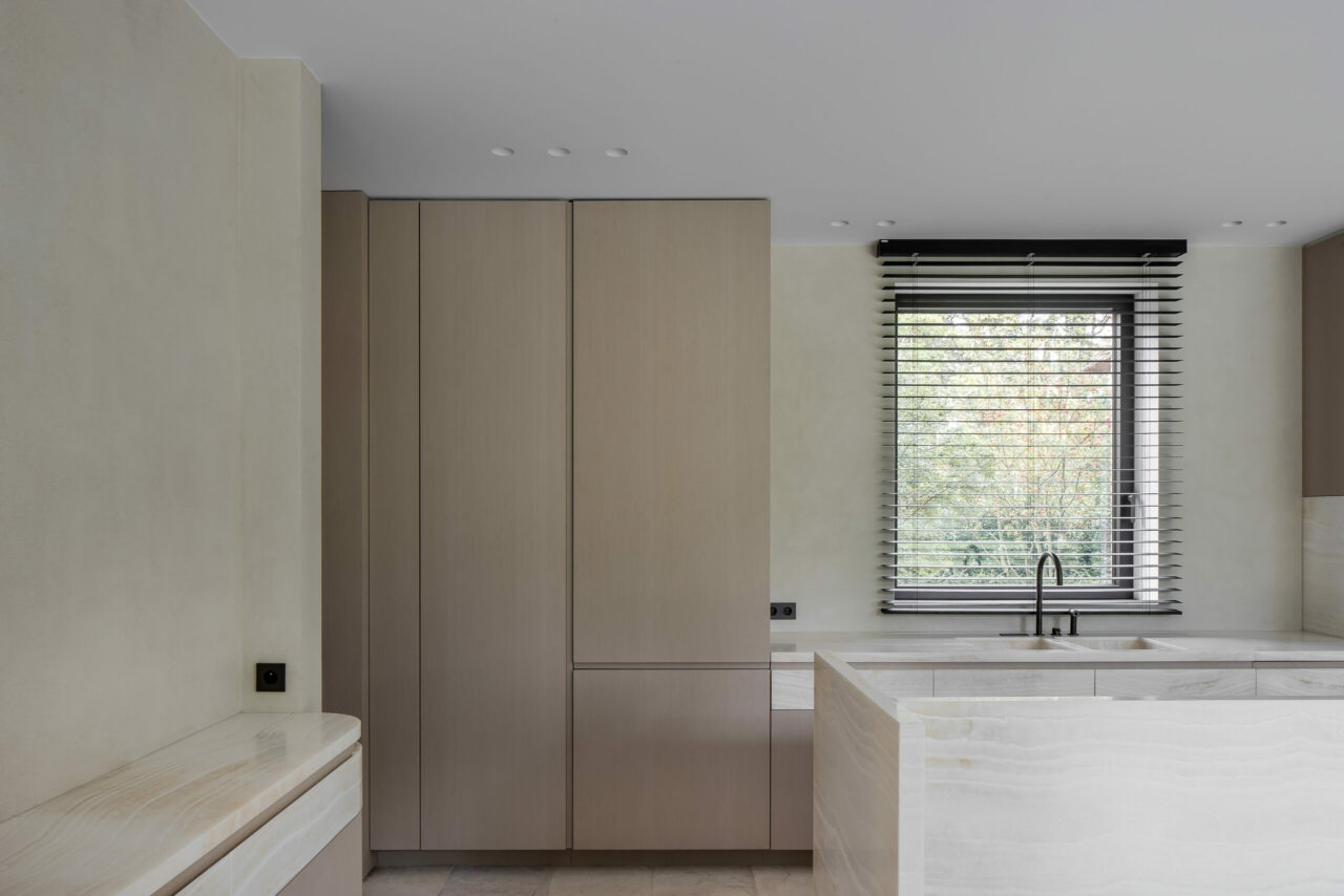 Und da kommen wir auch schon zur DVB Residence. Geplant von einem ortsansässigen Architekturbüro, zeichnet für die Innenausgestaltung der Innenarchitekt Dries de Malsche verantwortlich. Er hat dem markanten Haus mit dem für die Gegend signifikanten Reetdach – mit sehr tief gezogenem Dachüberstand – und großzügigen Fensterflächen Leben eingehaucht. Dabei lag der Fokus auf einer Verbindung zwischen innen und außen. Durch seine Lage in Küstennähe, umgeben von Dünen, beziehen sich die gewählten Materialien und Formen im Haus auf die Farbe und das Gefühl von Sand und Meer. Das belgische Büro von de Malsche mit Sitz in Sint-Niklaas arbeitet an nationalen und internationalen Projekten. Dabei setzt es auf authentische Materialien wie Holz, Marmor und Stein und schafft so Orte, die Reinheit, Harmonie und Gelassenheit vermitteln sollen. Der Innenarchitekt ist bekannt für seinen Sinn für Details, der in hand- sowie maßgefertigten Möbeln und traditionellen Bautechniken zum Ausdruck kommt – ohne sich dabei von Trends leiten zu lassen.