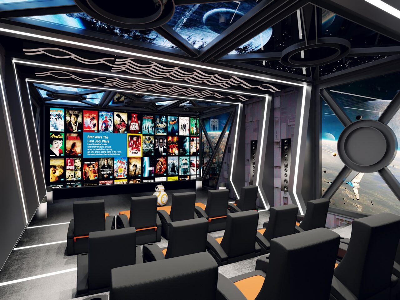 Das Aussehen dieses Kinos ist natürlich sehr wichtig, und hier ist die Fähigkeit, wirklich maßgeschneiderte Sitzlösungen von Fortress Seating zu liefern, so entscheidend. Sie bieten nicht nur höchsten Komfort, sondern tragen auch dazu bei, das Star Wars-Thema des Saals zu vervollständigen. Dies gilt auch für die in den Kinosaal eingebauten Vicoustic-Akustikplatten. Sie bündeln und verbessern nicht nur den Klang im Kinosaal, sondern sorgen auch für das gewisse Extra, um den Look zu vervollständigen.